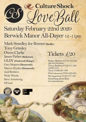 Culture Shock returns to Berwick Manor On 22nd February for another top Party With Djs on the day/night Marcus Dryden Lee Priest Steve Armstrong Ben Gould Tony Grimley Owen Clarke Gary Simpson Nick Woods Mark Smedley Joe Bonner James Parker Stuart J Giles Matt Smith On Percussion Matt Early & Greg Bedford See you all on the dance floor